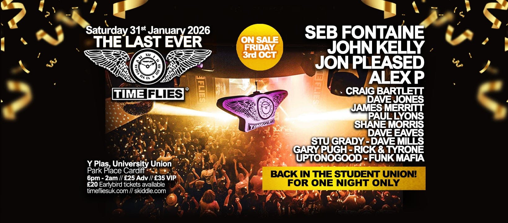 Time Flies is one of the UK’s longest standing house music promoters. DJs who have played for Time Flies include Sasha, Carl Cox, Tiesto, Paul Van Dyk, John Digweed, Paul Oakenfold, Pete Tong, Armin Van Buuren – the list is endless. Since 1994 we have staged Wales’ biggest parties, and provided tens of thousands of people with some top quality occasions. In 2019 we celebrated our 25th Anniversary with two monumental parties at Cardiff Tramshed, and were back there again in 2020 on Friday 7th February, with another total lock-out, starring House legend Todd Terry.